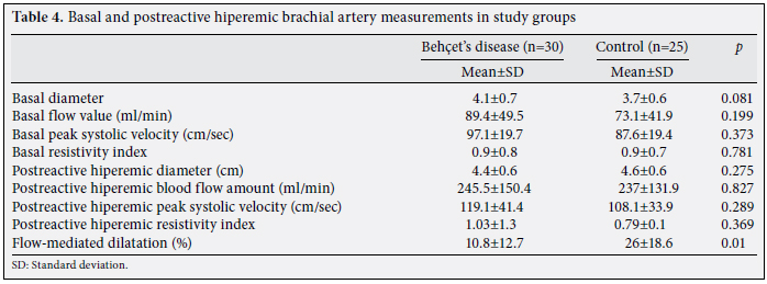 Patients and methods: Thirty patients with BD and 25 healthy volunteers were included. Doppler US was used to measure the basal and post-reactive hyperemic diameters, peak systolic velocities, resistivity indices, and blood flow volumes of the brachial arteries. Flowmediated dilatation was defined as the percentage of difference between the post-reactive hyperemic and basal diameters.