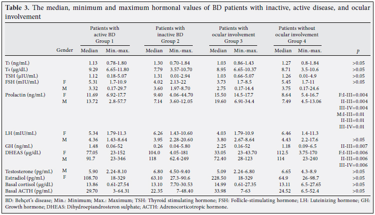 Results: No clinically significant differences were found between the BD groups and negative control group in terms of the basal serum levels of the hypophysial, thyroidal, adrenal, and gonadal hormones. When the hormonal values were evaluated with regard to disease activity and ocular involvement, the BD patients with ocular involvement showed significantly higher PRL and GH values in both genders and significantly lower DHEAS levels in female patients.