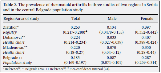 Patients and methods: Two representative regions of Serbia were chosen for the survey. The first region selected was the Zlatibor region located in the mountainous part of Western Serbia with a predominantly rural population. This study included patients registered in 1997. Two studies were also carried in the region of Belgrade, the capital. One of these studies was conducted in 2001 in the northern part of the city in Dobanovci, an urban suburb. The other took place in 2007 in Mladenovac, a southern suburb of Belgrade with a combined rural and urban population. The medical documentation for all patients diagnosed with chronic polyarthritis was reviewed to verify the diagnosis of RA according to the American Rheumatology College (ARC) 1987 revised criteria. The prevalence of RA was estimated based on the entire population over the age of 18 for Zlatibor region and over the age of 20 in the two studies in the Belgrade area.