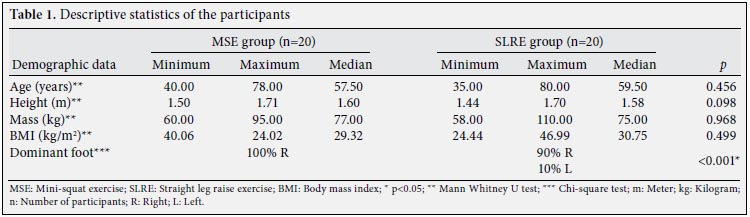 Patients and methods: Forty female patients (mean age 59.93±10.61 years; range 30-65 years) who were admitted to Başkent University Hospital between February 2009 and February 2010 with bilateral knee OA were included in this randomized controlled double-blind clinical trial. The patients were assigned into two groups, including SLRE and MSE. Both exercise groups were scheduled for a threeweek program of five sessions per week. Both groups also received an electrotherapy program in each session. Knee pain using the visual analog scale (VAS), physical performance using Timed Up and Go (TUG) Test, isokinetic quadriceps and hamstring muscle strengths using Cybex II, static balance using SportKAT 3000, physical function using Knee Injury and Osteoarhtritis Outcome Score-Physical Function Short Form (KOOS-PS) were assessed at baseline, at treatment end, and one month after treatment end.