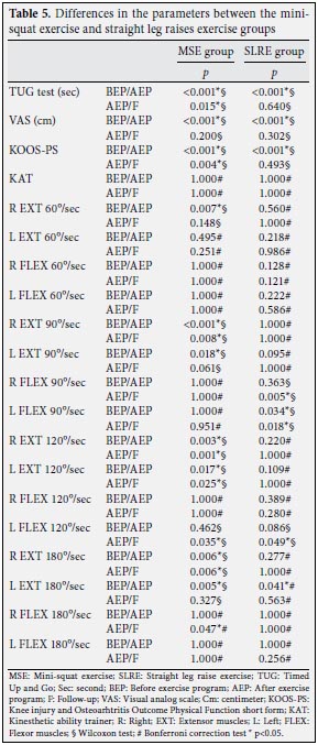The MSE group had significantly lower TUG test scores and higher torque for right knee extension at 60°/sec (p=0.024), 90°/sec (p=0.003), 120°/sec (p=0.005) and 180°/sec (p=0.017) than the SLRE group at the end of the exercise program (Table 2, 3).
