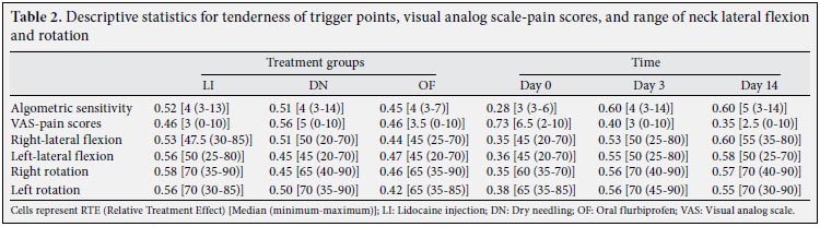 Although there were no significant differences between the groups in terms of age and duration of symptoms, the gender distribution was different (Table 1), but since gender is not a factor that affects the response to the treatments in MPS, the authors ignored this difference. The descriptive statistics of the groups are presented in Tables 2 and 3. The groups were similar in terms of pre-treatment algometric sensitivity, VAS-pain scores, restrictions regarding neck range of motion, and NHP. The p values are provided in Tables 4 and 5.