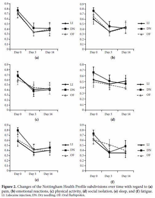In our study, the VAS-pain scores, NHP, and algometric sensitivity improved in all three groups, and no differences were discovered between the groups in terms of these improvements. Hong[6] compared the efficiency of DN and LI in a study consisting of 58 patients with MPS in the upper trapezius muscle. Subjective pain severity was evaluated by VAS, the pain threshold by algometry, and neck range of motion by goniometry in the Hong study. The VAS, algometric sensitivity, and range of motion improved in both injection groups, and the differences between the groups were not significant immediately after treatment. This was similar to our results; however, unlike our study, the pain intensity was lower in the LI group after two weeks.
