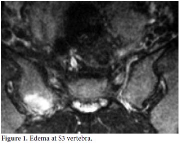 On physical examination, there was direct sensitivity at her right sacroiliac joint, but there was no swelling. Patrick's test (flexion, abduction, external rotation) was positive on her right side. She was first evaluated with plain radiographs, bone scintigraphy, and laboratory tests. The radiographs were normal, and the bone scan revealed an increased uptake on the right side of the sacrum adjacent to the sacroiliac joint. The tests for erythrocyte sedimentation rate (ESR), C-reactive protein (CRP), leukocyte count, and brucella agglutination were normal. An MRI showed a non-specific edema of the bone marrow at the posterior corner of the sacrum which could have been easily misdiagnosed as sacroiliitis (Figure 1). A computed tomography (CT) scan revealed a nidus located posteriorly at the S2 vertebra of the neighboring sacroiliac joint (Figure 2).