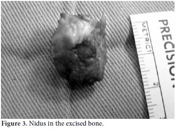 Surgical resection of the osteoid osteoma through a direct incision located at the sacroiliac joint brought immediate relief of the symptoms, and a pathological examination after en bloc surgical excision revealed the diagnosis (Figures 3 and 4).
