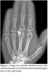 A 30-year-old female patient came to our clinic complaining of pain and swelling in the third metacarpophalangeal joint of the right hand. She described a slowly growing mass and progressively increasing pain in this joint, especially when she made a fist. A semi-rigid, fixed mass of approximately 2.5x1 cm in size was palpated in the physical examination of the patient, but there was no redness or feeling of heat emanating from it. Hand functions, such as grasping or holding, along with finger mobility were within normal limits. In addition, the patient had no other systemic symptoms or findings of arthritis such as fever, arthralgia, or swelling in the joint. A mass composed of calcium deposits was present in the third metacarpophalangeal joint of the right hand in the X-ray radiographs (Figure 1). The patient's medical history revealed nothing of consequence, and the plasma uric acid level and other routine preoperative blood tests were within normal limits, except for a slightly elevated level of the plasma pseudocholinesterase enzyme activity. While the mass lesion was dissected from the surrounding soft tissues, a milky fluid was discharged, A 2.5x1x0.5 cm size rubbery mass with a rigid center was then removed (Figure 2). Amorphous monosodium urate crystal bands surrounded by macrophages, lymphocytes, and multinuclear giant cells together with fibroblastic proliferation associated with tophaceous gout were encountered under polarized light in the histopathological examination of the removed mass (Figure 3). A detailed physical examination along with more laboratory tests and radiographs were performed after the histopathological diagnosis, and all were normal. After a one-year follow-up, the patient's plasma uric acid levels were still within the normal limits, and there had been no acute attack of arthritis. The patient was free of pain, and her hand functions were satisfactory.
