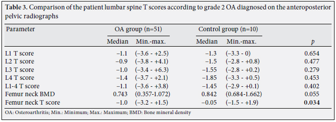 For both groups, the lumbar spine T scores based on the OA grades as determined by AP pelvic radiographs along with the femoral neck BMD and femoral neck T scores were compared, but no significant correlations were detected.