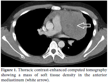 The patient was admitted to the rheumatology department at our West China Hospital in June of 2012 due to a two-month history of left chest pain accompanied by fatigue, accidental palpitation, and dyspnea. His lupus status was inactive at that time with a Systemic Lupus Erythematosus Disease Activity Index 2000 (SLEDAI-2K) score of 4 due to pleurisy and pericarditis. After thoracic computed tomography (CT), the existence of a tumor measuring 7.5x11.5 cm was confirmed in the anterior mediastinum (Figure 1). A percutaneous biopsy also suggested a type C thymoma (undifferentiated carcinoma) (Figure 2).[8] As a preoperative therapy, the patient had undergone four rounds of chemotherapy and 11 rounds of radiotherapy. At the one-year followup, his SLE was stable with a SLEDAI-2K score of 0.