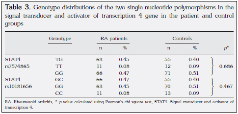 Conclusion: Our study results indicated that the rs7574865 and rs10181656 polymorphisms in the STAT4 gene were not associated with a susceptibility to RA in the Turkish population.