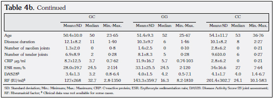 Thereafter, we studied the relationship between the genotype distribution of the two polymorphisms and the clinical and laboratory data in the RA group. The stratification analysis was undertaken to account for age, disease duration, and the number of swollen and tender joints in the patients as well as the results of the laboratory investigations involving CRP, ESR, the RF values, and disease activity evaluations (DAS28).