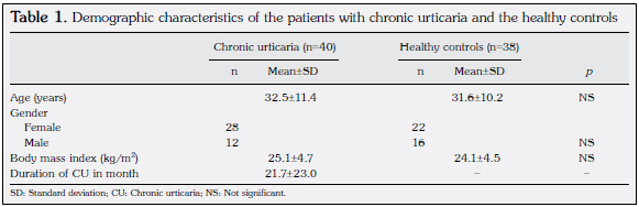 There were no significant differences between the CU patients and the HCs with respect to age, gender, or body mass index (BMI). We also determined that the duration of urticarial symptoms ranged between 3 and 96 months in the patients with CU (Table 1).