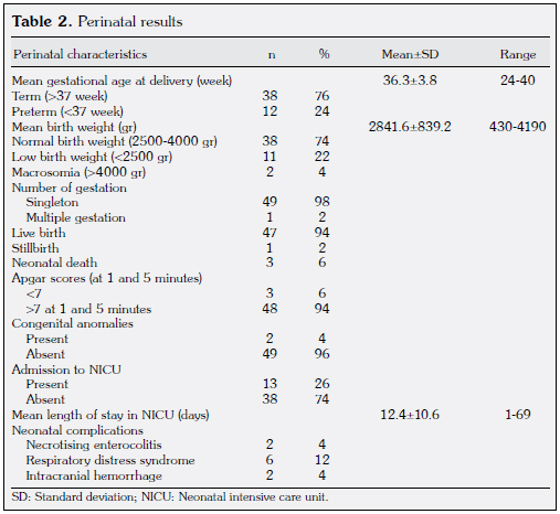 Patients and methods: Fifty pregnant women (mean age 29.5 years; range 19 to 39 years) with FMF were enrolled between January 2002 and December 2012. Patient data were collected from computerized database. Clinical characteristics including demographics, pregnancy outcome, maternal and fetal complications during pregnancy or delivery, hypercoagulation disorders and colchicine use were recorded. Labor patterns and perinatal outcomes were assessed.