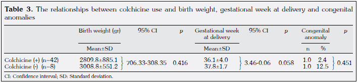 The independent-samples T test was used to assess the association between birth weight, gestational week at delivery and congenital anomalies and colchicine use. Preterm delivery (p=0.058), low birth weight (p=0.416) and congenital anomalies (p=0.451) were not significantly associated with colchicine therapy. We observed a slight but statistically insignificant difference in gestational week at delivery between the colchicine groups (on therapy or not) with a p value of 0.058. This was thought to be due to the small number of the study group. The statistical details are shown in Table 3.