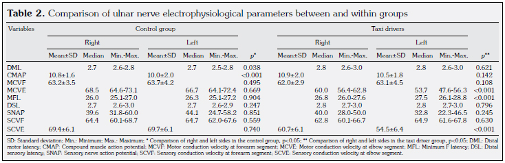 Electrophysiological examination showed that radial sensory nerve conduction velocities and SNAP amplitudes were normal in both groups. Median and radial nerve electrophysiological findings did not differ significantly between the taxi drivers and control groups. In the taxi driver group, right side and left side ulnar nerve motor and sensory conduction velocities at the elbow segment were significantly slower, and the ulnar nerve minimum F latencies were significantly longer as in the control group (Table 2). Comparison of right and left ulnar nerve conduction parameters between taxi drivers and the control group is given in Table 3.