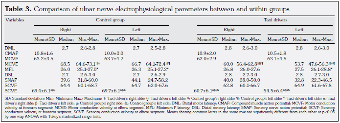 Patients and methods: The study was performed between December 2008 and February 2009 in Ankara and included 40 male taxi drivers (mean age 35.5±7.3 years; range 25 to 54 years) and 40 healthy male controls (mean age 33.6±6.1 years; range 25 to 54 years). Nerve conduction studies were performed on both upper limbs of all participants.