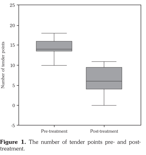 Results: The number of tender points was significantly reduced at the evaluation of post-treatment compared with baseline (p<0.001). However, there were no significant differences between pre- and post-treatment for the scores of the Pittsburgh Sleep Quality Index, the Beck Depression Inventory, and the Beck Anxiety Inventory (all p>0.05).