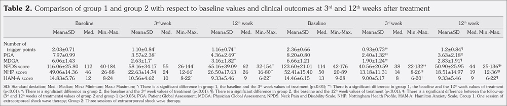 The Minilith SL1 shock-wave generator (Storz Medical, Switzerland; ED= 0.25 mJ/mm2, 1000 shock waves) was used. Group 1 received a single session of ESWT for 10 minutes, while group 2 received three sessions of ESWT with a one-week interval between each session in the same manner. The patients were evaluated prior to treatment followed by three and 12 weeks after treatment. The number of TPs, Patient Global Assessment (PGA) and Physician Global Assessment (MDGA) scales, Neck Pain and Disability Scale (NPDS), Nottingham Health Profile (NHP) and Hamilton Anxiety Rating Scale (HAM-A) were used to assess the effectiveness of the treatments.