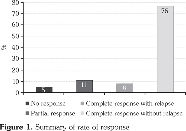 Concerning the safety profile of rituximab, this study showed no statistically significant change in liver, kidney or bone marrow laboratory markers before and after treatment. The most common side effects observed were benign and consisted mainly of infusion reactions. This safety profile has been highlighted in many other studies. Ceccarelli’s safety study on SLE found adverse event rates comparable to the placebo, with the only differences being leukopenia (12.3% vs. 4.2%), neutropenia (5.5% vs. 1.4%) and hypotension (11% vs. 4.2%).(15) Medeot et al.,(16) on the other hand, ascertained a rituximab safety profile in patients with refractory ITP. They found that rituximab administration was associated with two episodes of short-term toxicity, namely a mild infusion reaction and a case of serum sickness syndrome, which improved rapidly with steroids; no infectious or other significant long- term complications were documented.