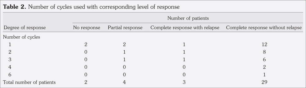 1 cycle, 10 patients received 2 cycles, whereas eight patients received a third cycle.