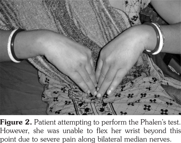 Physical examination revealed proximal muscle weakness of the upper and lower limbs (muscle test 3/5), and weakness of the distal muscles of both hands, in the abductor pollicis brevis, opponens pollicis, flexor pollicis and the first and second lumbricals particularly. The Phalen’s test (Figure 2), reverse Phalen’s test and Tinel’s sign were positive. However, the patient was unable to perform the test accurately due to the pain along the bilateral median nerves. All other systemic examination findings were noncontributory, and there were no clinical manifestations of acromegaly.