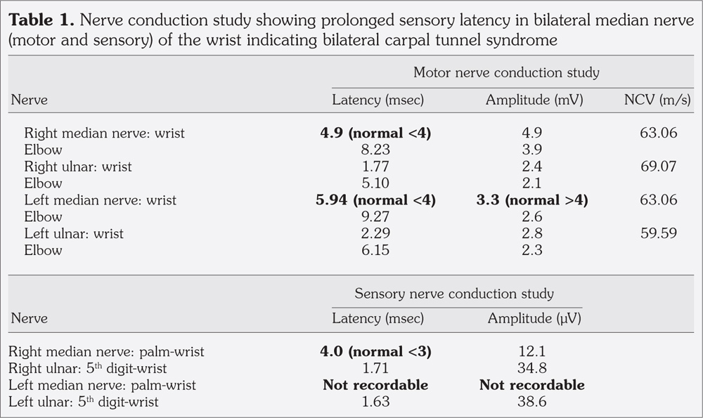 Inflammatory muscle diseases are a heterogeneous group of systemic autoimmune disorders characterized by chronic muscle weakness, muscle fatigue, and histologically mononuclear cell infiltration into the skeletal muscle. Weakness of the shoulder and hip girdle muscle constitutes one of the predominant presenting features of polymyositis with arthritis (affecting small joints, in particular), skin rashes, constitutional features (fever, fatigue, and malaise, etc.), and cardiac, gastrointestinal, and pulmonary manifestations in a wide range of patient subsets. On the other hand, polymyositis may occur in the absence of muscle pain or constitutional symptoms. It may present in an acute, subacute, or chronic insidious form.(1) Although rare, carpal tunnel syndrome (CTS) may also develop in the presence of inflammatory myositis. In the literature, CTS which was detected incidentally during nerve conduction studies (NCS) in few cases of inflammatory myositis was reported with an estimated prevalence of 8%.(2) In our case, the predominant symptom was proximal muscle weakness of all four limbs, which was associated with a tingling sensation and weakness of distal muscles of the hands. The patient was eventually diagnosed with polymyositis with bilateral CTS.