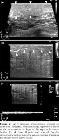 A 45-year-old woman was admitted to our hospital for the evaluation of a painless and palpable lump in her right axilla. The patient discovered the mass two weeks ago. The mass was poorly defined and felt soft upon palpation. The patient history had no trauma injection of exogenous substances or topical application of oily substances in the affected area.