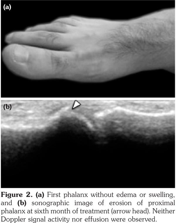 A 49-year-old man was admitted to our clinic with pain, acute-onset swelling, and local erythema in his right big toe. He was under valsartan hydrochlorothiazide treatment for hypertension. The medical history was non-specific. He did have no constitutional symptoms such as morning stiffness, fatigue and fever. Physical examination revealed swelling, local erythema (Figure 1a) and pain on palpation of the right big toe. Serum C-reactive protein level was 14.6 mg/L (normal range: <10), and uric acid level was 10.1 mg/dl (normal range: 3.5-7.2). Complete blood count, erythrocyte sedimentation rate, blood urea nitrogen and creatinine levels were within normal limits. While foot radiograph was unremarkable (Figure 1b), ultrasonography showed sugar cluster appearance and effusion with increased power Doppler activity (Figure 1c, d). Monosodium urate crystals were detected in synovial fluid aspiration, and the patient was diagnosed with gout. Oral colchicine 1 mg/d and diclofenac sodium 150 mg/d were commenced. Valsartan hydrochlorothiazide was changed to valsartan, and amlodipine was added for hypertension treatment. Uric acid poor diet and hydration were also recommended. Uric acid levels were 9.1 and 7.1 mg/dl at the first and sixth month controls, respectively. A significant improvement in the swelling was detected on physical examination (Figure 2a). On the other hand, ultrasonography showed erosion of the proximal phalanx (Figure 2b).Gout is one of the most common forms of inflammatory arthritis characterized by the crystallization of uric acid (monosodium urate crystal deposition) within the joints.(1) The first metatarsophalangeal joint is distinctive, and 50 to 90% of the attacks involve the first metatarsophalangeal joint.(1,2) However, midfoot joints and ankle can also be involved.(1,2) Urate crystals are mainly deposited in the superficial portions of the articular cartilage.(3) Imaging modalities in gout can provide diagnostic clues. Although X-rays can show erosions, which are among the chronic stage characteristics in gout, detection of early soft tissue changes, erosions, hypervascularity, and small tophi by X-rays can be challenging. Magnetic resonance images are also quite useful to detect early erosions, synovial hypertrophy, and joint effusion. However, magnetic resonance imaging can be expensive and poorly accessible. On the other hand, ultrasound can be a convenient imaging modality for gout to show joint effusion, early erosions, crystals, hypervascularity, and disease activity with several advantages such as the ease of application, lack of ionizing radiation, low cost, and repeatability. Ultrasound provides dynamic imaging as well.(4) Ultrasound can be used not only for the first-time diagnosis but also for clinical follow-up since irregular hyperechoic bands (double contour sign) may be seen in the late periods of gout.(5) Herein we once again emphasize the role of ultrasound in the diagnosis and clinical follow-up of gout.