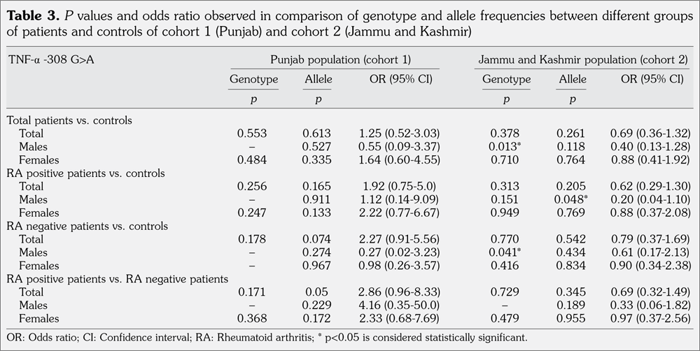 Patients and methods: A total of 251 blood samples were collected comprising 131 samples from Punjab (cohort 1) (40 RA positive and 43 RA negative and 48 healthy controls) and 120 samples from Jammu and Kashmir (cohort 2) (44 RA positive, 36 RA negative and 40 controls). Genotyping was based on amplification refractory mutation system-polymerase chain reaction, followed by agarose gel electrophoresis.