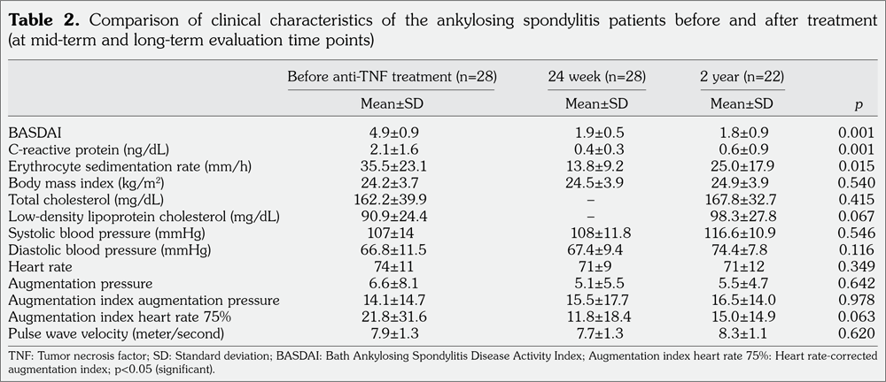 Patients and methods: A total of 28 active ankylosing spondylitis patients (21 males, 7 females; mean age 33.5±9.5 years; range 20 to 52 years) were enrolled. Patients’ values for before the initiation of biological therapy and mid-term (24 weeks) evaluation were reported. For further evaluation, this initially reported patients were contacted two years after anti-TNF-α therapy, and their arterial stiffness was assessed by using pulse wave velocity.