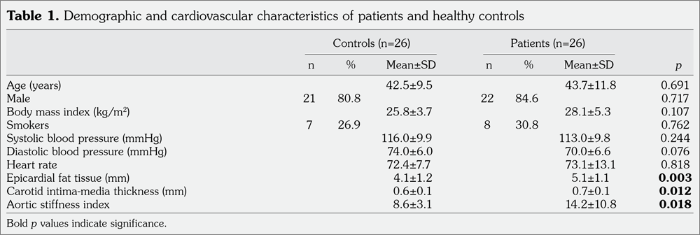 Patients and methods: Twenty-six AS patients (22 males, 4 females; mean age 43 years) and 26 age- and sex-matched healthy controls (21 males, 5 females; mean age 43 years) were included. Patients and controls with any reported cardiovascular disease or other comorbidities were excluded. Disease activity, functional capacity and spinal mobility were measured using the Bath Ankylosing Spondylitis Disease Activity Index, Bath Ankylosing Spondylitis Functional Index, and Bath Ankylosing Spondylitis Metrology Index, respectively. All patients underwent complete transthoracic echocardiographic examination including epicardial fat thickness and ASI, and sonographic examination including CIMT.