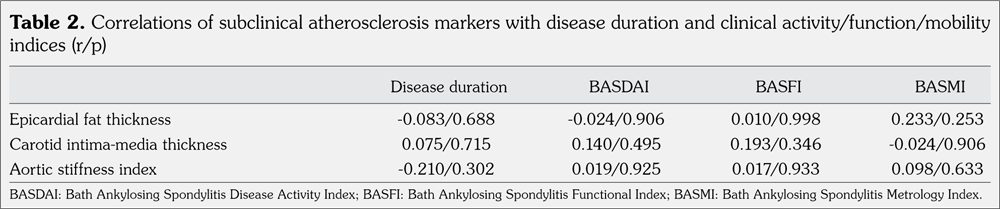 There were no significant correlations between the subclinical atherosclerosis markers with disease duration and disease activity/function/ mobility indices (p>0.05; Table 2).