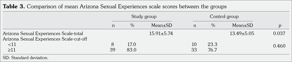 Mean ASEX total score of the patient group was significantly higher than the control group (15.91±5.74 and 13.49±5.05, respectively) (p=0.03). Scores in the categories of ASEX-subjective sexual arousal (“how easily are you sexually aroused?”) (p=0.03) and ASEX-objective sexual arousal (“how easily does your vagina become moist?”) (p=0.01) were significantly lower in the patient group than the control group. There was no significant difference between the two groups regarding the cut-off points. Eighty three percent (n=39) of the patient group had ASEX-total scores equal to or higher than the cut-off point (which was 11), while 76.7% (n=33) of the control group had scores equal to or higher than the cut-off point (p=0.46) (Table 3).