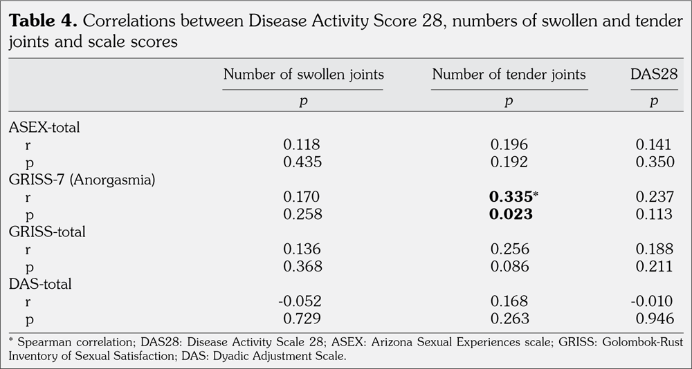 No correlation was found between the DAS28, the number of swollen and tender joints, scores of scales/subscales measuring marital adjustment (DAS scores), and sexual functioning and satisfaction scores (GRISS-total, ASEX-total scores) (p>0.05) (Table 4). A significant correlation was only detected between the GRISS anorgasmia subscale score and the number of tender joints (p=0.02) (Table 4).