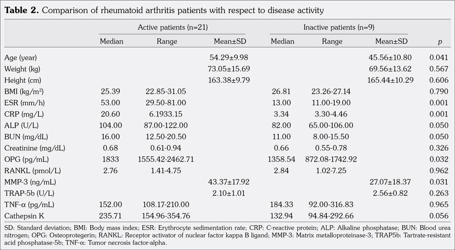 Results: Levels of RANKL, OPG, cathepsin-K, TNF-α and MMP-3 activities of the patients were significantly higher when compared with the controls (p<0.05). A comparison of the active and inactive patients with RA revealed that OPG levels and MMP-3 activities were significantly higher in active group than inactives (p<0.05), while there was no significant difference in TNF-α, RANKL levels, and tartrate-resistant acid phosphatase-5b and cathepsin-K activities between two groups (p>0.05).