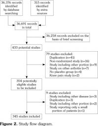 We identified 36,691 citations (PubMed, 1,646; SCOPUS, 32,246; Cochrane Registered Trials, 2,484; and extra source, 315), of which 354 reports were identified as potentially eligible for our analyses (Figure 2). Of these, a total of nine reports were excluded since some included other diseases (n=3), some were duplicates (n=3), some reported data combined over the hip and knee joints (n=2), or included randomized patients of both genders but reported only female patients (n=1). The total number of reports analyzed was 345, which presented 352 trials.