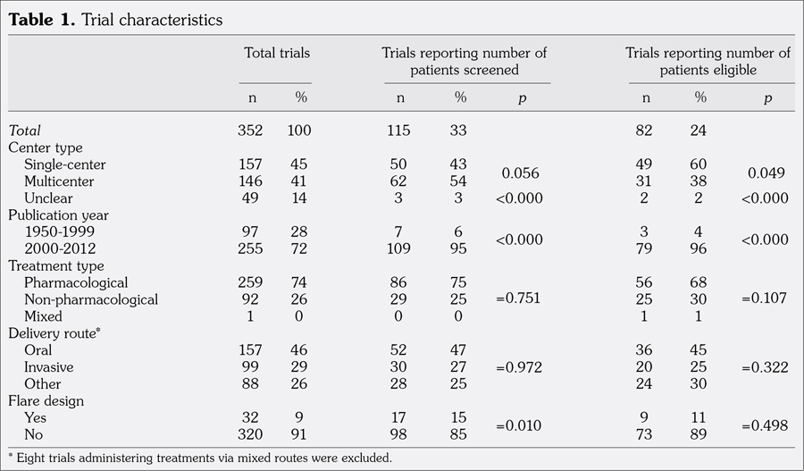 Table 1 describes the characteristics of the trials included in our analysis. A small number of trials (33%) reported information about the number of screened patients. Reporting the number of patients screened was significantly associated with the publication year and flare design. The number of patients who were eligible was reported in 82 (24%) trials. Reporting the number of patients eligible was significantly related to the center type and publication year. Overall, trials published after 2000 tended to report sufficient information about the recruitment process.
