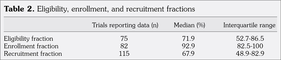 Table 2 presents data on the eligibility, enrollment, and recruitment fractions. With respect to the eligibility fraction, only 75 (21%) trials provided sufficient data for calculation. In these trials, the median proportion of potential patients who were eligible for trials was 71.9% (interquartile range: 52.7 to 86.5%). Regarding the enrollment fraction, 82 (23%) trials presented sufficient information. A median of 92.9% of eligible patients was randomized in these trials (interquartile range: 82.5 to 100%). Of these, 21 trials reported that 100% of eligible patients were randomized in a trial. In the remaining trials, reasons for why eligible patients were not randomized were reported as “refusing to participate” (38%), which was the most common, followed by “no interest” (17%), and “other” (16%). The overall recruitment fraction varied greatly across trials. In the 116 (33%) trials that reported adequate data for analysis, the median recruitment fraction was 67.9% (interquartile range: 48.9 to 82.9%). The median NNS was 1.5 (range: 1 to 10). To summarize, some trials randomized every potential patient screened for eligibility, whereas others screened as many as 10 potential patients for each patient finally randomized.