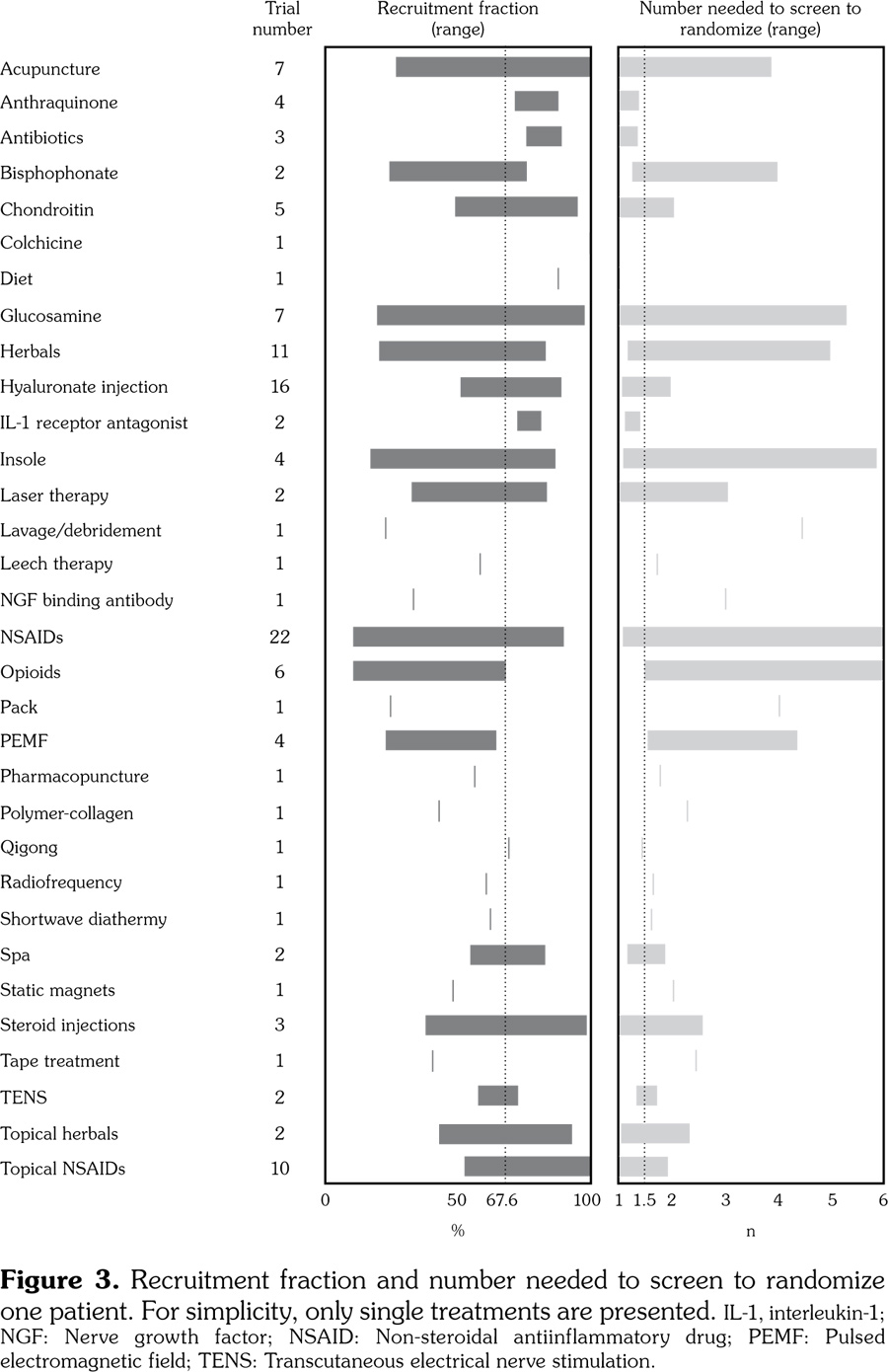 Meanwhile, a previous study showed that the median NNS was 1.3 in rheumatoid arthritis trials,(15) which is consistent with our finding. This study suggested that rheumatoid arthritis trials were excellently generalizable since three patients were screened for every two enrolled in the trials.(15) Because KOA trials also screened three patients for every two enrolled, it can be argued in general that KOA trials were of good quality for external validity.