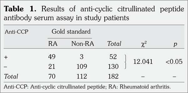Patients and methods: Results of both anti-CCP and RF detection in 70 RA patients (13 males, 57 females; mean age 49.2±12.1 years; range 35 to 61 years) and 112 non-RA patients (35 males, 77 females; mean age 42.5±7.1 years; range 35 to 49 years) were retrospectively and statistically analyzed.