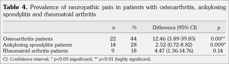 The prevalence of neuropathic pain was higher in patients with OA [odds ratio=12.46 95% confidence interval (3.89-39.85)] (p=0.00) and in patients with AS (odds ratio=4.47 95% confidence interval (1.36-14.76)] (p=0.009), compared with controls (Table 4). There was no statistically significant difference between neuropathic pain prevalence of RA and control group [odds ratio=2.52 95% confidence interval (0.72-8.82)] (p=0.14) (Table 4).