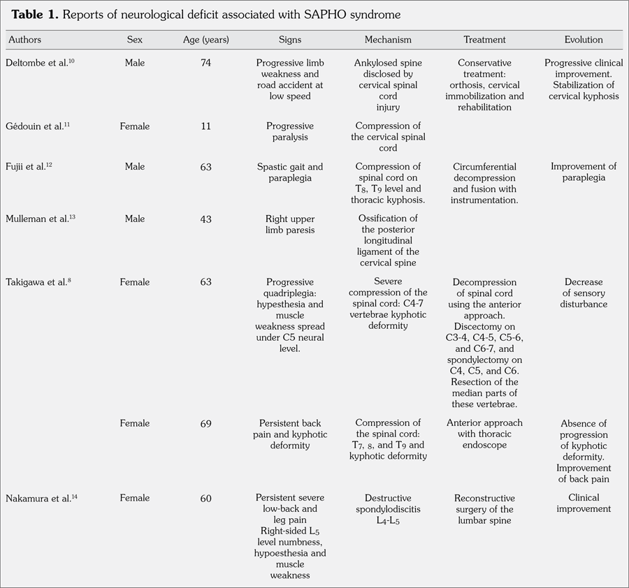 The spinal lesions in SAPHO syndrome usually have a good prognosis and rarely cause neurological deterioration.(5) In fact, they generally have an insidious onset and repeated recurrence and remission. In SAPHO syndrome, destructive lesions progress associated with marginal sclerosis explaining why destructive spondylodiscitis progresses slowly. However, if the speed of destruction by inflammation is faster than that of sclerotic reaction, the spinal structure would break.(8) We described herein a case of SAPHO syndrome complicated by severe destruction and kyphotic deformity leading to paralysis. To our knowledge, there are only seven cases of SAPHO syndrome with neurological deficit summarized in Table 1.(9-14) Surgery was performed leading to improved neurological signs.
