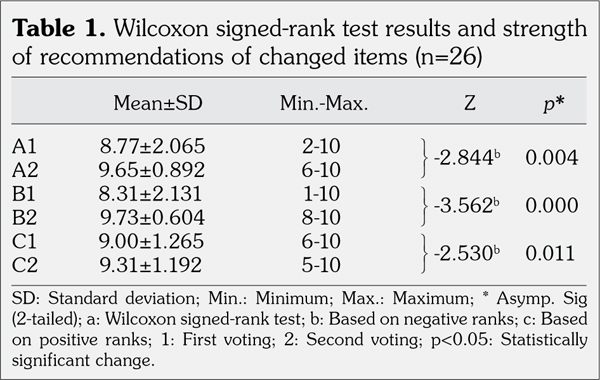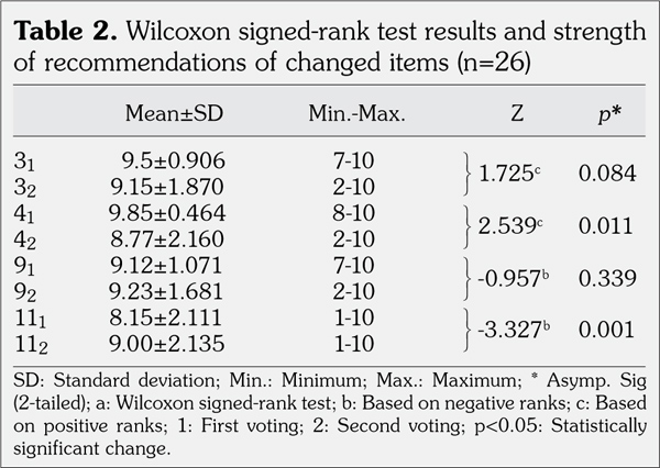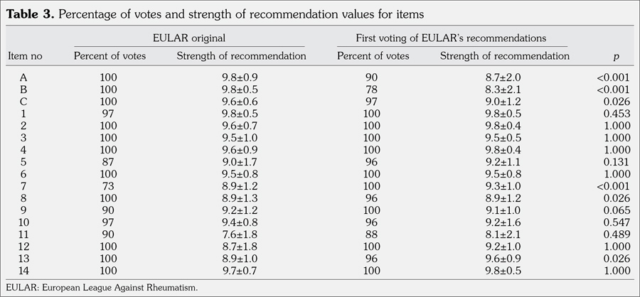 Patients and methods: Members of Turkish League Against Rheumatism and one rheumatoid arthritis patient voted for the 2013 recommendations of the European League Against Rheumatism for treatment of rheumatoid arthritis in two sessions. An item was changed and voted again only if at least 70% of participants wanted a change. Strength of recommendations was calculated for the items. Strength of recommendations for the changed items in the first and second voting rounds was compared by Wilcoxon signed-rank test. In case of significant difference, the item with higher strength of recommendation was accepted. In case of no difference, the changed item was selected.