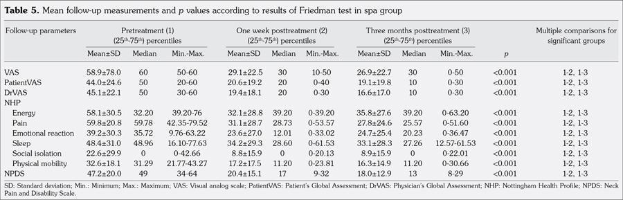 Tables 5 and 6 show the mean follow-up measurements and p values according to the results of Friedman test in the spa therapy and exercise therapy groups, respectively.