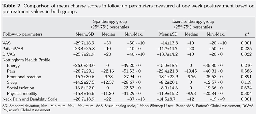 Statistically significant improvements were observed in all parameters assessed at both one week and three months after completion of treatment in spa therapy and exercise therapy groups. Then, mean changes achieved at one week and three months posttreatment were compared in both groups to determine which group had greater improvement.
