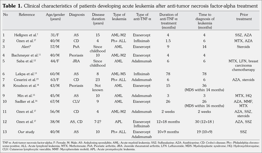 In the literature, acute leukemia cases due to anti-TNF-α treatment were also reported; however, not as much as lymphoma.(8-16) First case was published in 2003.(8) The Food and Drug Administration declared 44 AML cases which developed under the treatment of anti-TNF-α drugs. No details of subtypes, survival, or demographic data were given.(9) The relevant case reports about acute leukemia after anti-TNF-α treatment published on MEDLINE are reviewed in Table 1.(10-16) Ten of the 13 reported patients who developed acute leukemia after anti-TNF-α had AML. AML development may be attributed to higher incidence of this disorder in adults; however, Ph chromosome positivity in all of the three ALL cases is interesting. A first case of Ph+ ALL in a patient receiving anti-TNF-α (infliximab) was described in 2003.(18) Then, Cesarini et al.(19) reported a second case in a patient receiving adalimumab in 2010. According to our knowledge, our Ph+ ALL patient represents the third case in the literature that developed in a patient treated with anti-TNF-α drugs.