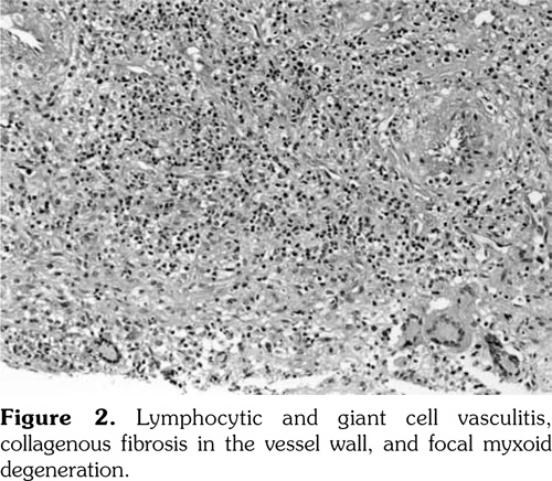The histological work up showed lymphocytic and giant cell vasculitis, collagenous fibrosis in the vessel wall, and focal myxoid degeneration (Figure 2). Takayasu’s arteritis was considered in differential diagnosis and a magnetic resonance angiography scan of thorax and abdomen showed significantly decreased right subclavian artery calibration whereas abdominal aorta, renal arteries, and celiac trunk calibration was normal. Rheumatoid factor, antinuclear antibodies, anti deoxyribonucleic acid antibody, viral serology, and antineutrophil cytoplasmic antibody were all negative.