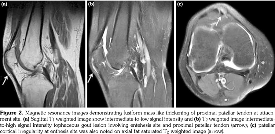 Gout is a clinical disorder resulting from urate crystal deposition.(1) Tendinopathy and enthesopathy are extra-articular gout manifestations. The common sites involved in knee are the popliteus tendon, cruciate ligaments, and quadriceps tendon.(2) Although patellar tendon has been mentioned as a possible involvement site, to our knowledge, only three case reports exist in the literature, two of which were reported in triathletes mimicking patellar tendonitis precipitated due to prolonged exercises.(3-5) In this article, we report a 34-year-old male patient with eight years history of gout who presented with one week history of pain and swelling of extremities. He underwent excision of the olecranon bursae and biopsy from the tophus involving first toe three years ago. Recurrent gouty attacks were treated with nonsteroidal anti-inflammatory drugs, colchicines (1 mg/day), and analgesics. Serum uric acid level was 11.9 mg/dL, C-reactive protein was 18.2 mg/dL. Allopurinol had been discontinued due to elevated liver enzymes (alanine transaminase: 132 U/L; aspartate aminotransferase: 85 U/L). Physical examination demonstrated tophi overlying the toe, and tenderness over the caudal aspect of patella. The patellar tendon was slightly thickened on radiographs. Soft tissue tophus at the interphalangeal joint causing adjacent