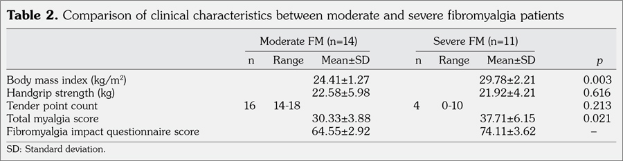Patients and methods: Twenty-five female patients (mean age 34±9.2 years; range 20 to 50 years) with FM and 23 age- and body mass index-similar healthy females (mean age 35.3±9.2 years; range 26 to 46) were included. Demographic characteristics of the subjects were recorded. Tender point count was noted in the patient group. Also; total myalgia score and fibromyalgia impact questionnaire scores were calculated. Handgrip strength was measured with Jamar® dynamometer. Patients who had fibromyalgia impact questionnaire scores ≥70 out of 100 were considered to have severe FM, while those who had scores <70 were considered to have moderate FM.