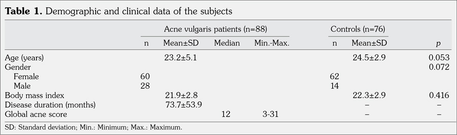 Demographic and clinical characteristics of the subjects are given in Table 1. There were no significant differences regarding age, sex or body mass index between the groups (all p values >0.05). Approximately 99% of the acne patients had mild (n=73) or moderate (n=14) acne severity.
