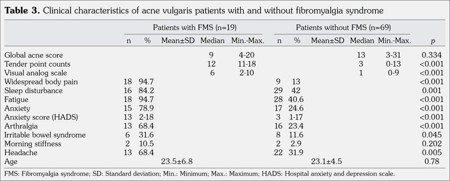 American College of Rheumatology diagnostic criteria were used for the diagnosis of FMS.(7) Acne vulgaris was evaluated by using the Global Acne Scale. This sorting scale is used to determine the severity of the acne by evaluating the types of acne lesions (no lesions= 0, comedones= 1, papules= 2, pustules= 3, and nodules= 4) and their anatomic locations (forehead= 2, right cheek= 2, left cheek= 2, nose= 1, chin= 1, chest and upper back= 3). The local score is determined by multiplying the anatomic location score by the grade (0-4), and the global score is the sum of the local scores. The Global Acne Scale score ranges from 0 (no acne), 1-18 (mild acne), 19-30 (moderate acne), 31-38 (severe acne), and >39 (very severe acne).(8)